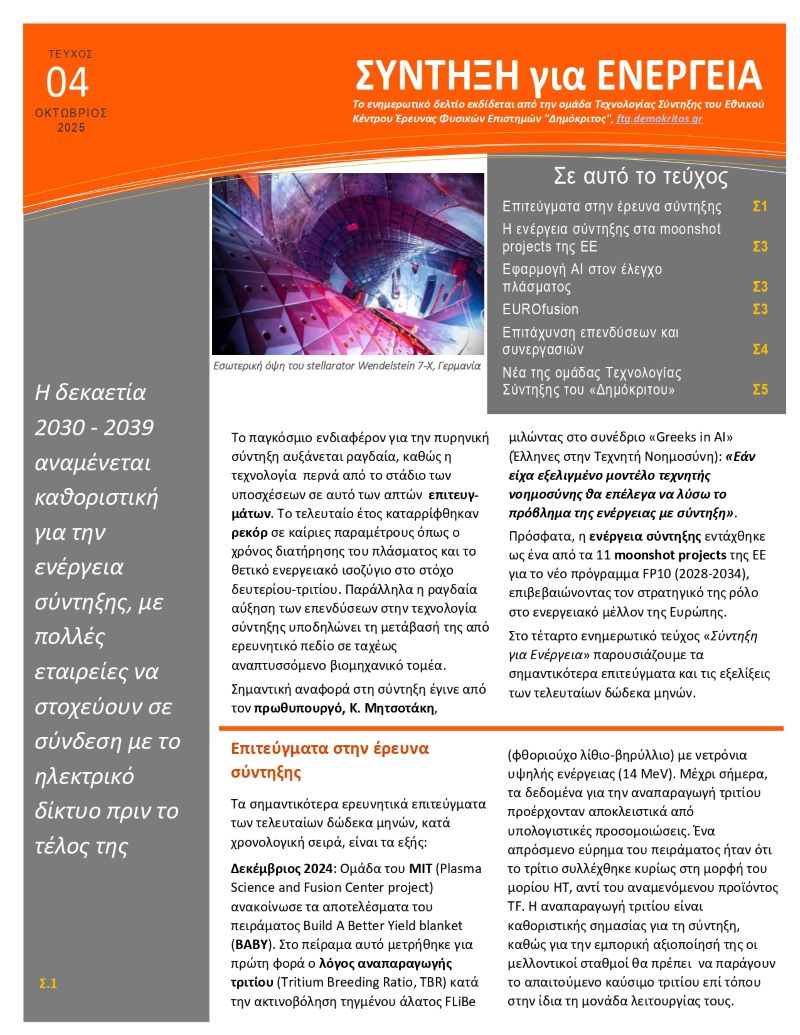 The Newsletter "Σύντηξη για Ενέργεια" is a publication produced by FTG in the Greek language, with the aim to inform the Greek public, the industry and the wider academic community on recent advances in the quest for the realization of fusion energy. It comes out in 2 or 3 issues per year.